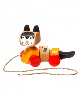 Pull toy in the shape of a kitten made of natural and environmentally friendly wood.