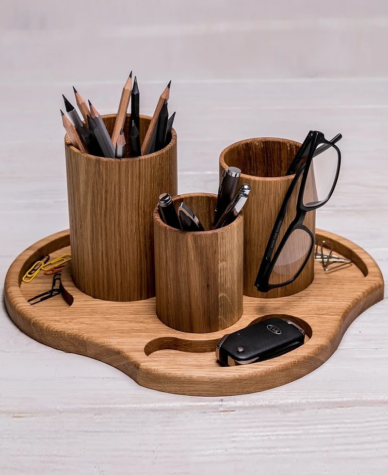 The walnut desk organiser ‘Volcano’ will be a stylish and practical addition to your workspace. It is ideal for storing pens, pencils, markers or make-up brushes, keeping your desk tidy and organised. The three removable cups, carefully hand-polished, slot easily into the base and hold securely, ensuring safe transport and easy assembly.