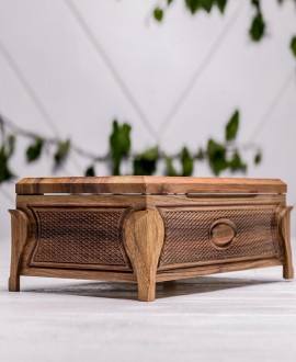 A stylish walnut jewellery box with four carved legs will become an elegant accessory for storing personal items. Thanks to the premium quality metal hinges, the lid opens smoothly without touching the base. The inside is lined with velvet, which is available in black, burgundy, blue or bottle colours. Other shades are available upon request.