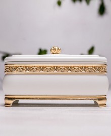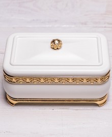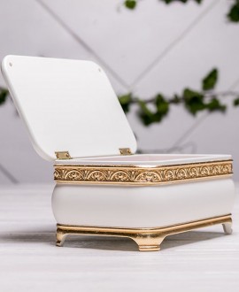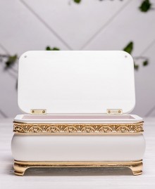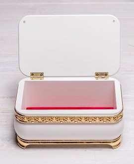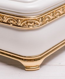 This elegant alder wood jewellery box, painted white with gilding (imitation gold leaf), will be a stylish addition to a woman's boudoir. The gilded details are lacquered for durability, and the interior of the base is lined with premium velvet.