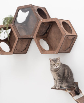 The set of three honeycomb-shaped wall shelves is a complete eco-system for your pet, transforming an empty wall into an exciting vertical world. Thanks to three separate modules, you get endless design possibilities: arrange them in a classic beehive shape, cascade them, or spread them across the wall to create a complex route. This is the perfect choice for owners of several cats or one very active explorer who needs more space for play and relaxation.