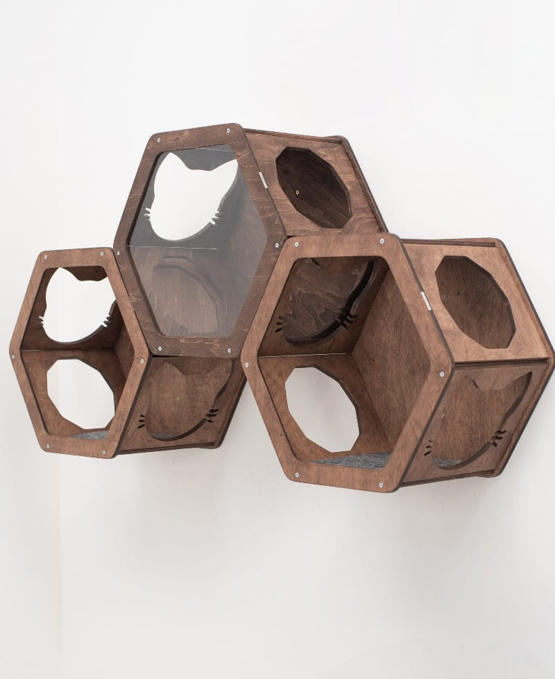 Each honeycomb is made of high-strength birch plywood and can withstand heavy loads. The hexagonal shape gives your cat a feeling of security on all sides, creating the perfect conditions for a peaceful sleep. The wood surface is carefully sanded by hand and coated with natural oil wax, making the product safe, pleasant to the touch and resistant to daily cat entertainment.