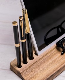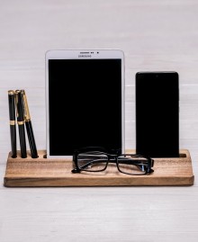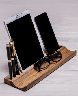 A small, but very practical accessory Wood gadget stand "Compact". This organizer contains keys, business cards, pens and other trinkets you need. You can also place a phone (90 mm long groove) or a small tablet (142 mm long) on this stand, so that they are always at your fingertips. The peculiarity of this accessory is that it is very compact, which saves space on the desktop.