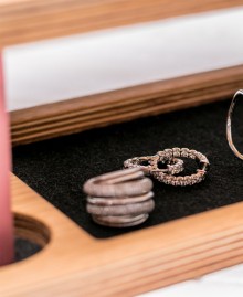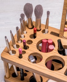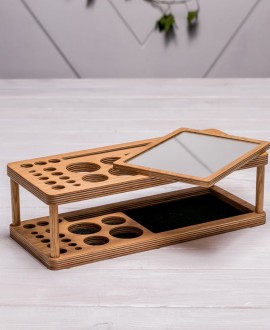Wooden women's stand, which holds a lot of cosmetics, a bunch of small things that are important for creating the perfect makeup.