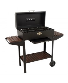 At the bottom there is another shelf for coals and the necessary equipment. The pull-out ash pan makes it easy to clean the appliance, and the wheels and the handle on the shelf make it easy to transport the barbecue.
