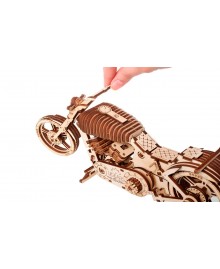 3d wooden construction set "Bike VM-02" is driven by a powerful rubber motor, which allows the motorcycle to cover a distance of up to three meters in one motor setting.