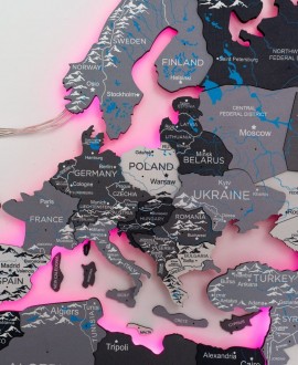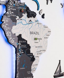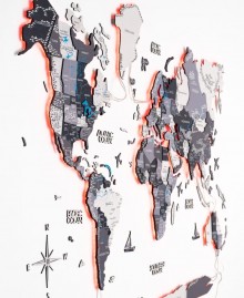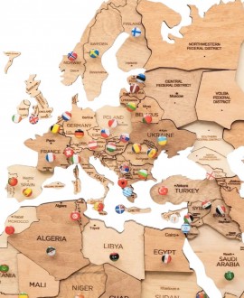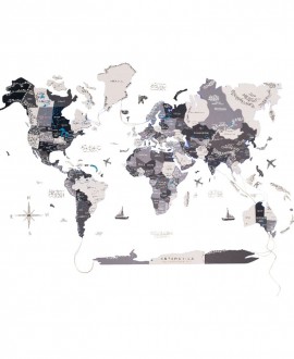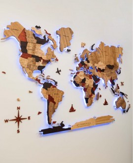 The map has a sturdy multi-layer structure made of fibreboard, where each layer forms a three-dimensional panel with clear contours of continents and islands. It is suitable for a living room, bedroom, home office or studio and can serve as a personal travel board where you can mark places you have already visited or plan future trips.