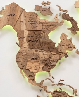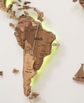 The multi-level world map "Walnut" with LED backlighting is a combination of deep relief, natural solid wood and atmospheric light. Thanks to its many layers, the map looks voluminous, and the rich walnut shade adds warmth and status to the interior.