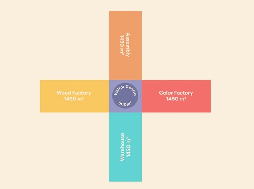 The Plus is conceived as the direct translation of logistics into architecture. The four production areas – the colour factory, the wood factory, the assembly department, and the warehouse – are arrayed around a central courtyard that forms the very heart of the building. The geometry provides an open and efficient workflow, while allowing all four wings of the factory to be in direct contact with the forest. At the centre of the building lies the experience centre, which provides 360-degree views of the whole production process.