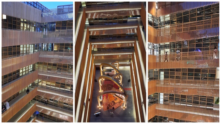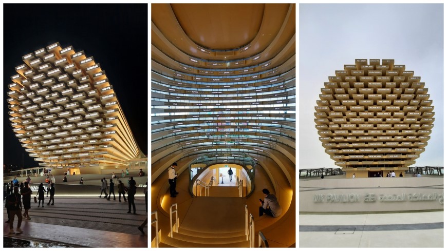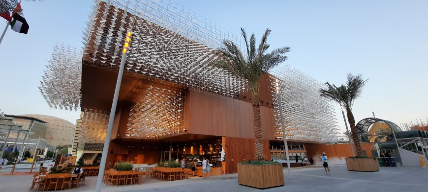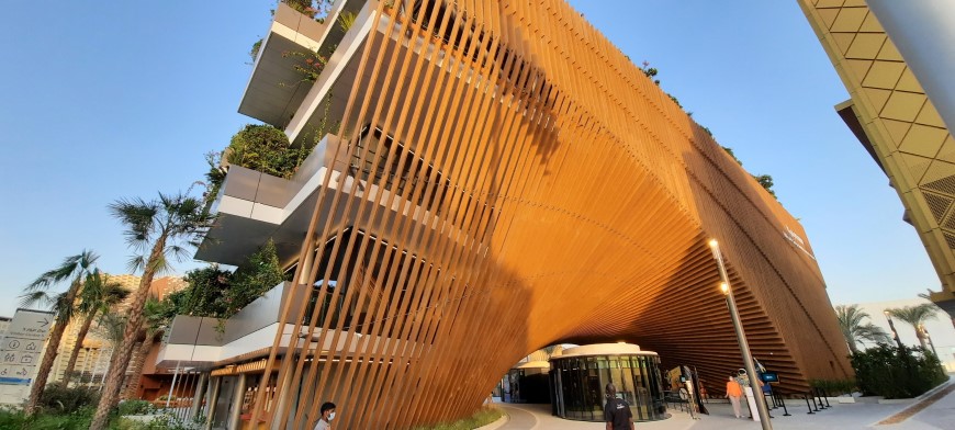 The Canada Pavilion is an impressive timber structure located in the "Sustainability" area. Its feature is a wooden lattice facade. The construction combines the beauties of Canada's nature and the architecture of the Arab world, and the main concept is to unite people to achieving a better future.