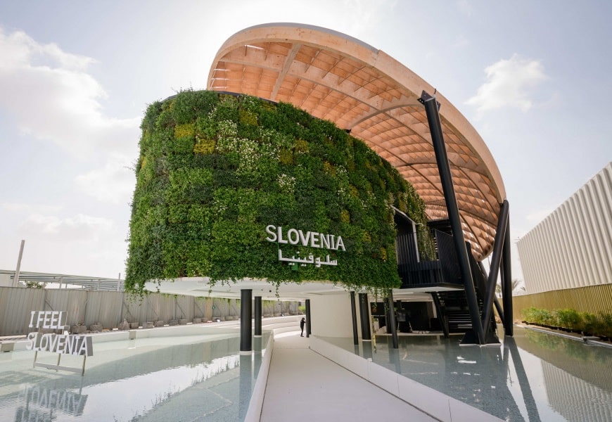 The Slovenian Pavilion is located in the "Sustainability" area and occupies 1550 square meters of exhibition space. The facade of the pavilion represents the Slovenian forest, trees are planted around the building, and the roof is made of wooden beams and resembles the shape of a sieve. The construction demonstrates the country's respect for sustainability, creativity, and innovations.