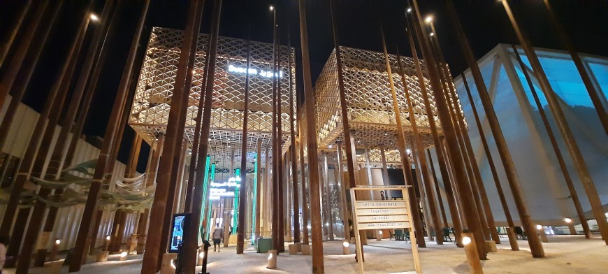 The Swedish Pavilion "Forest", located in the "Sustainability" zone, was used for construction only natural materials, instead of steel and concrete. The architects adhered green ideas in their creation, the principles of a circular economy, innovative technologies in the field of biology. The concept of the building is to recreate a dense Nordic forests and bring in elements of Arabic design.