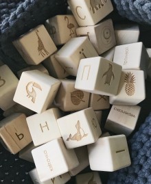 Each block features four engraved sides showing an illustration, uppercase letter, lowercase letter and a word matching the alphabet letter they represent (not necessarily the first letter in a word) - with two plain sides: top and bottom.