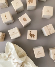 A set of 30 wooden blocks with the German alphabet from A-Z in natural colourway. Each cube has rounded edges. They are of the perfect size for small hands of a child.