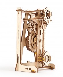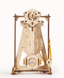 Its working principle is based on the model's constant amplitude oscillation under the force of gravity (weight) and potential energy (tension force) of the rubber band. The rubber band powers the mechanism of the model and compensates for the pendulum's oscillations' kinetic energy loss. The device is animated by means of gear unit with a windup wheel.
