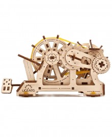 The mechanical puzzle Variator Ugears STEM lab is a fully functional wooden replica of a Belt-driven Friction Cone CVT. The Cone CVT varies the drive ratio by moving a wheel or belt up and down the axis of conical roller. In the Ugears model kit Variator, the belt, powered manually via the reducer, transfers the rotation to the driven cone pulleys.