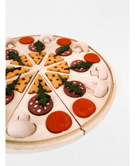 Each has a selection of ingredients: tomato, sausage, mushroom, cheese and arugula (made of felt).