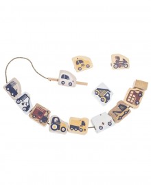 Cars 2 (lace-up) – a bright wooden toy that turns stringing into an interesting story about transport! Your little one assembles their motorcade by threading a string through the double holes in the figures – training their fingers, attention and coordination, while learning colours and types of cars.
