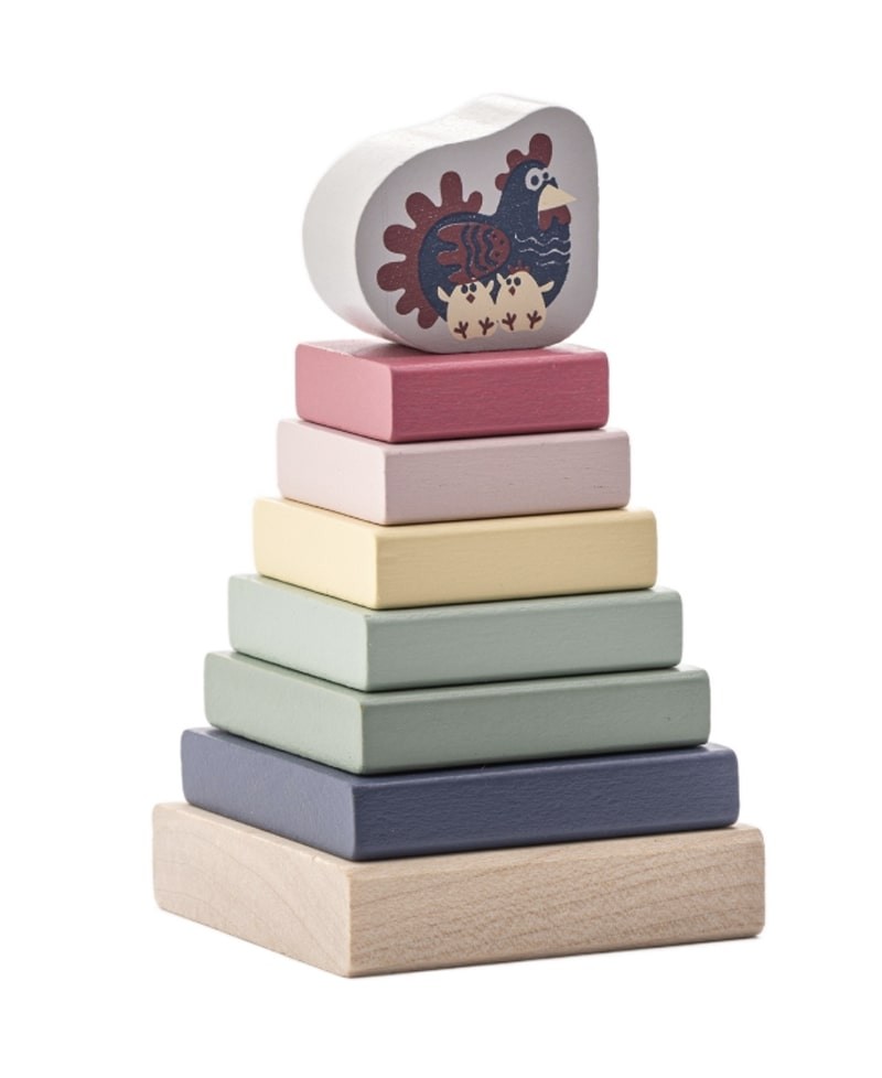 Among the delicate pastel shades on each of the 7 pieces, your child will find not only a variety of colours and sizes, but also a cute image of a hen with chicks. This real highlight stimulates curiosity and imagination. The base and each element are created with your baby in mind: softly sanded, easy to grasp, and pleasant to the touch.