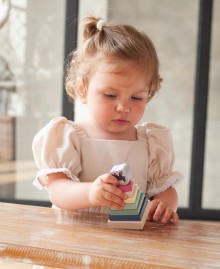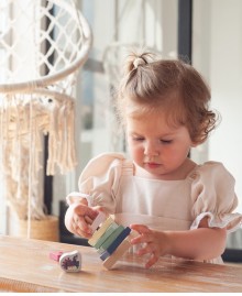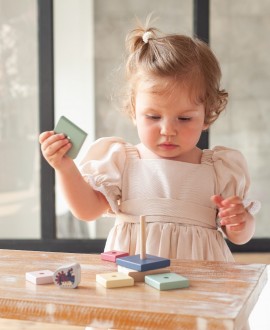 This pyramid is a wonderful example of how play can combine aesthetics and development. It teaches your child to distinguish colours and shapes, develops logic, fine motor skills and even social skills when played with adults.