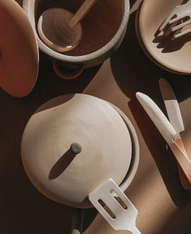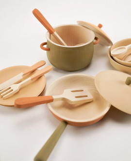The thoughtful dimensions of the items allow the baby to easily master the culinary arts: a large saucepan (12 x 12 x 10 cm) and a frying pan (12 x 12 x 4.5 cm) have convenient lids to "keep food warm". Setting the table becomes a real lesson in aesthetics with the use of deep plates (10.5 x 10.5 x 3 cm) and delicate flat plates (11.5 x 11.5 x 1.5 cm).