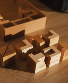 The uniqueness of the set lies in the special shapes of the parts (H-, L- and T-shaped), which do not simply stack on top of each other, but create complex relationships and volumes. Each element is carved from a noble ash massif, which makes construction not only a visual but also a tactile pleasure. Hand sanding and finishing with natural oil and wax preserve the living energy of the tree, making the toy safe even for the smallest architects.