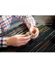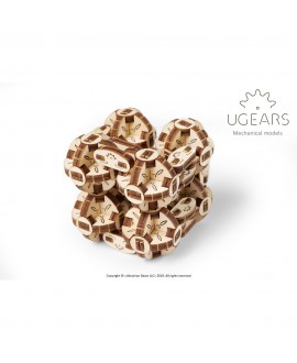 The mechanical model "Spherocube" after assembly takes the form of a kind of steampunk skeleton of a cube, which consists of eight wooden spheres interconnected by hinges that allow the spheres to roll relative to each other, forming various geometric shapes.