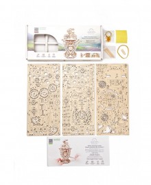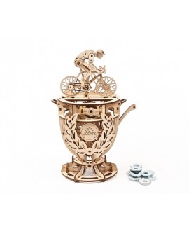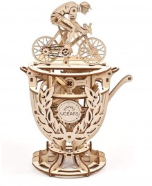 Model "Cyclist" is a 3D puzzle made of plywood boards, of average complexity of assembly. The structure consists of a cyclist who rushes towards victory and a champion cup that accommodates the mechanism. It is a small motor that makes the elements move without external energy, as if in front of us is a living person participating in the Tour de France cycling race.