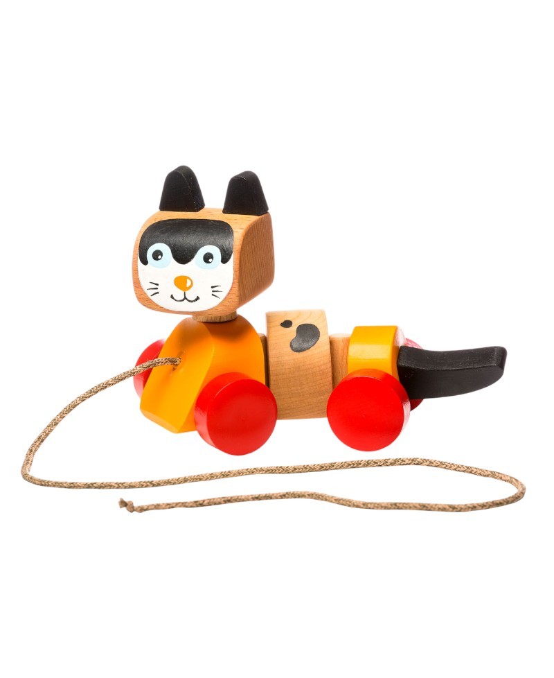 Pull toy in the shape of a kitten made of natural and environmentally friendly wood.
