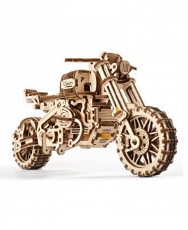 3d конструктор из дерева "Байк VM-02" приводится в движение мощным резиномотором, который позволяет мотоциклу преодолевать расстояние до трех метров за одно заведение мотора.