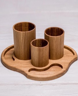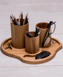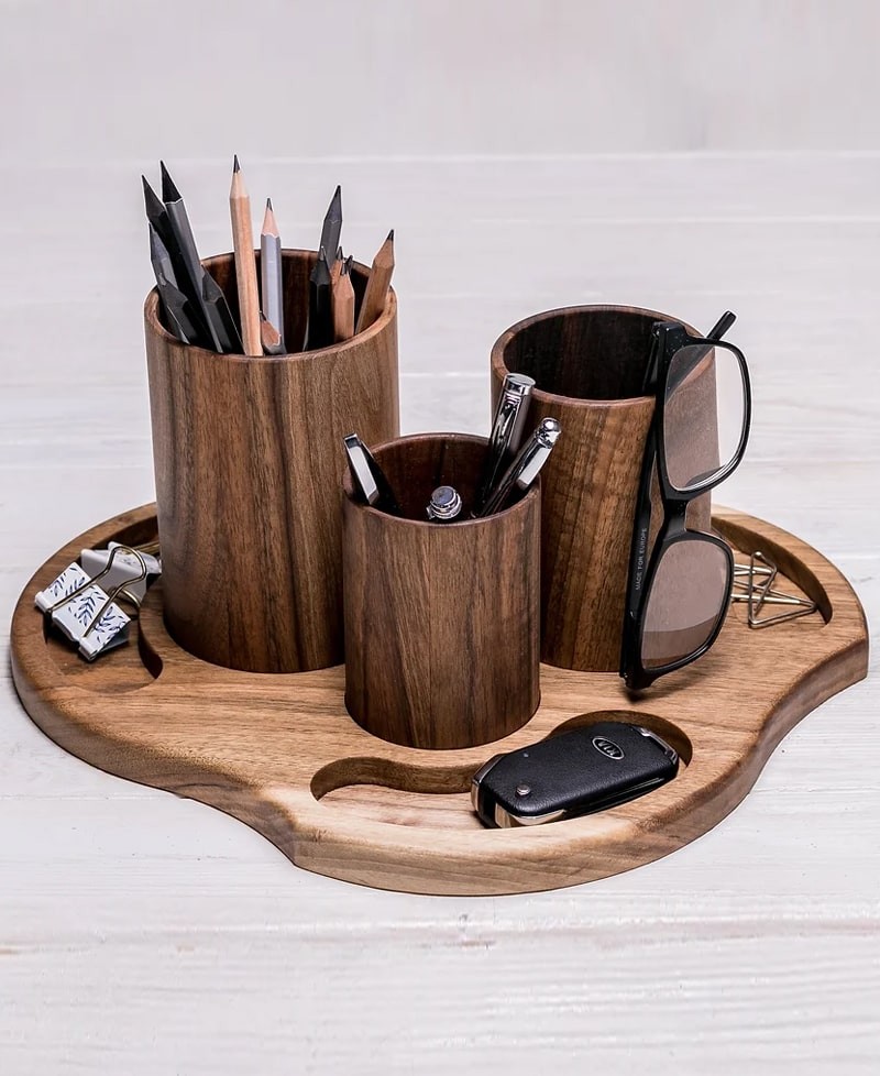 Настольный органайзер «Вулкан» из орехового дерева станет стильным и практичным дополнением вашего рабочего пространства. Он идеально подходит для хранения ручек, карандашей, маркеров или кисточек для макияжа, обеспечивая порядок на столе. Три съемные стаканы, тщательно отшлифованные вручную, легко устанавливаются в основание и надежно держатся, что обеспечивает безопасную транспортировку и простое складывание.