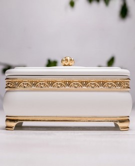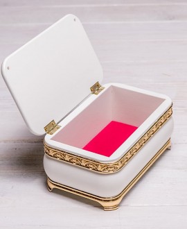 Элегантная шкатулка из древесины ольхи, окрашенная в белый цвет с позолотой (имитация сусального золота), станет стильным дополнением женского будуара. Позолоченные детали покрыты лаком для практичности, а внутренняя часть основы отделана премиальным бархатом.