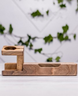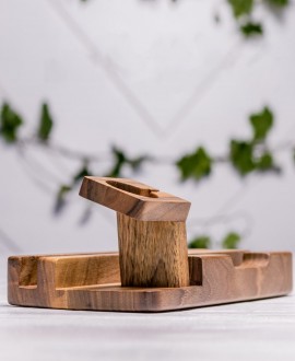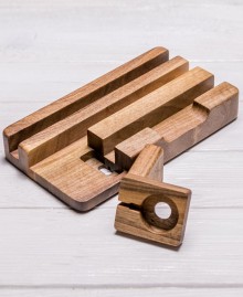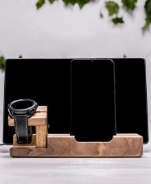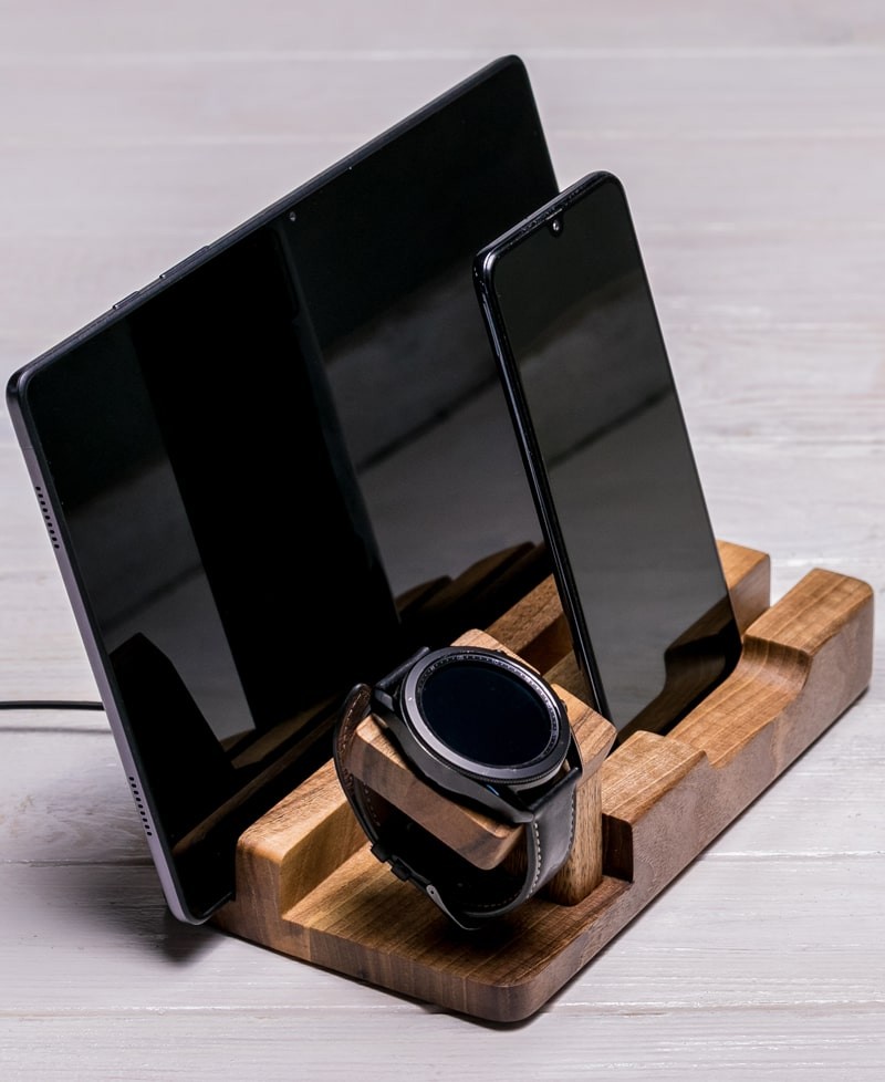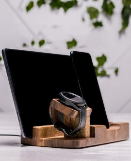 Вам подобаються вироби Samsung? Захоплюєтеся їхніми планшетами, смартфонами та годинниками? Ми створили стильний органайзер спеціально для вас. Він оснащений механізмом кріплення для зарядного пристрою годинника Samsung Galaxy, що дає змогу зручно розмістити його на дерев'яній підставці та заряджати. Годинник легко знімається без від'єднання кабелів. Телефон і планшет можна ставити горизонтально або вертикально, з кабелями збоку.