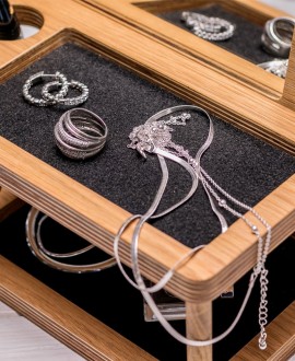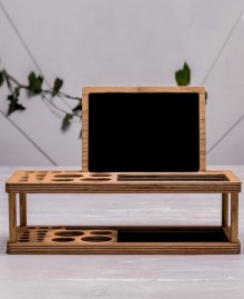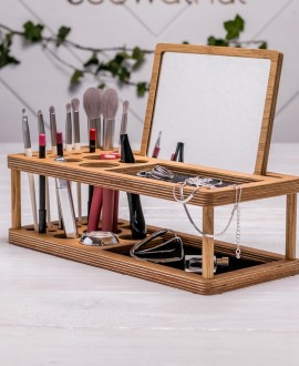 Деревянная подставка вмещает множество косметических средств и кучу мелочей, важных для создания идеального макияжа.