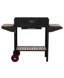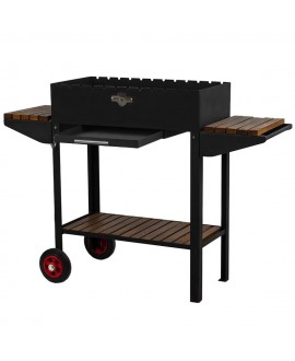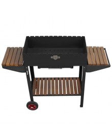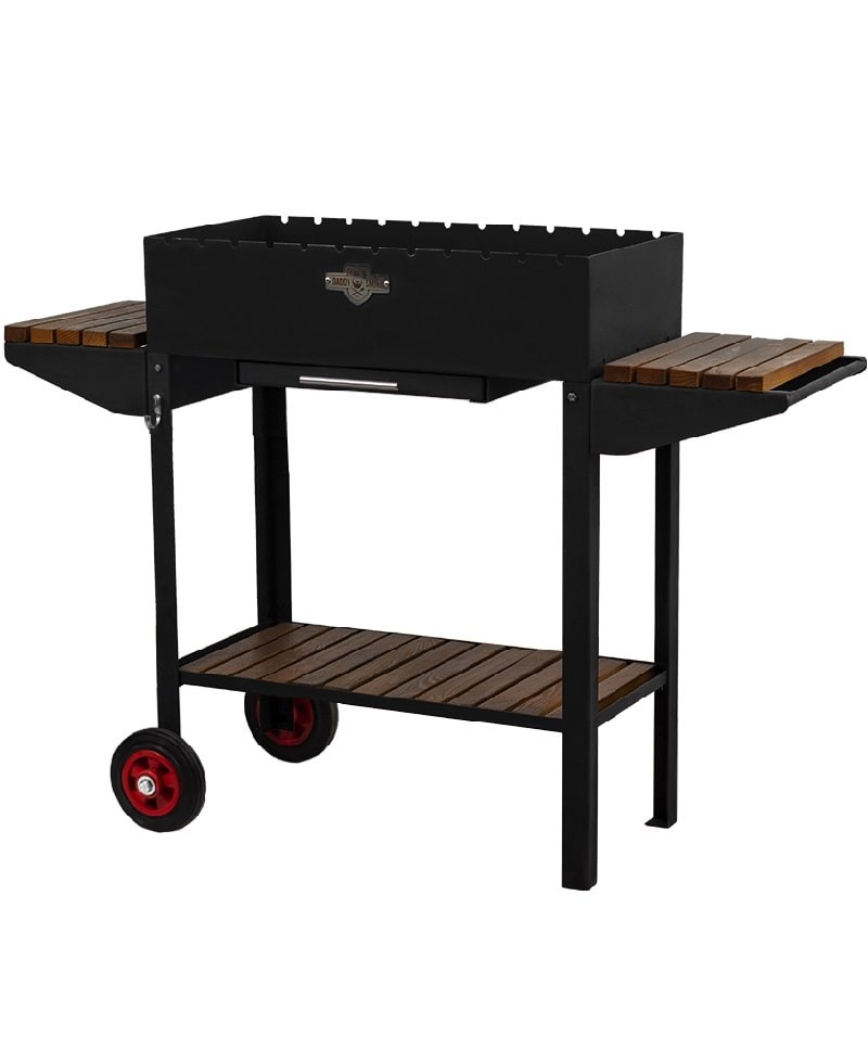 Для производства мангала используется сталь высокого качества. В конструкции предусмотрены столики с отделкой из дерева для расположения кухонных принадлежностей и продуктов. Под жаровней находится еще одна полочка для размещения продуктов, запасов угля или кухонной утвари.