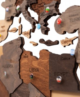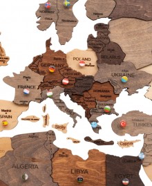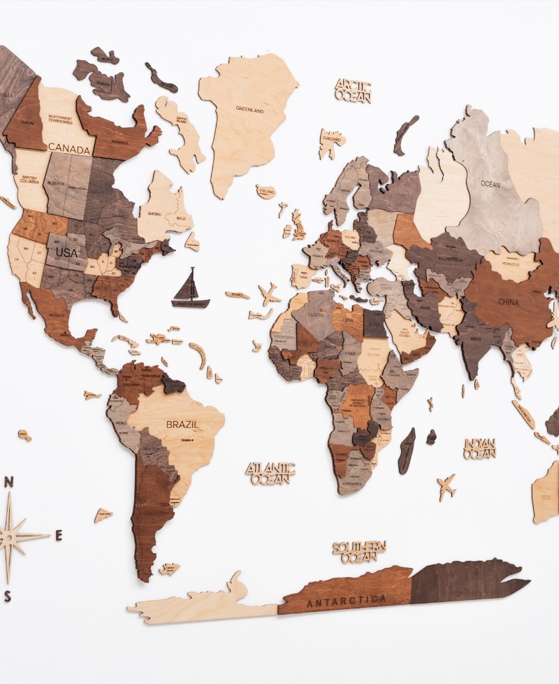 Изготовленная из материалов, тонированных масловосковой краской, карта сохраняет естественную текстуру дерева и выглядит натурально и стильно. Она станет прекрасным подарком для путешественников, семей, друзей или как индивидуальный декор для жилого помещения или рабочего пространства.