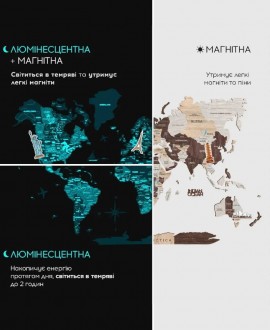 Деревянная карта мира «Люми» в цвете капучино – это стильное настенное панно из ДВП, которое сочетает эстетику дерева с эффектом свечения в темноте. Специальные нетоксичные краски накапливают свет днем и до 2 часов светятся ночью, создавая мягкую, уютную подсветку, которая подчеркивает контуры материков и океанов и хорошо вписывается в любой интерьер – от модерна до минимализма.