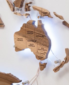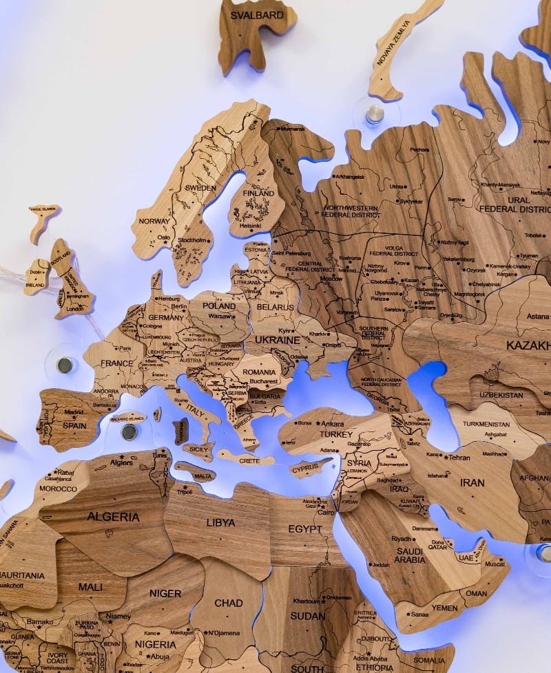 Встроенная светодиодная подсветка мягко подчеркивает контуры континентов и создает эффект «живой» карты на стене. Вечером карта работает как декоративный фоновый свет, добавляя уюта в гостиной, спальне, кабинете или творческом пространстве. Это не просто настенный декор, а акцентный элемент, который сразу привлекает внимание.