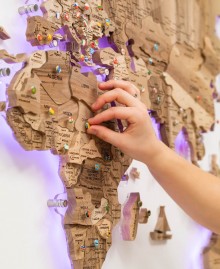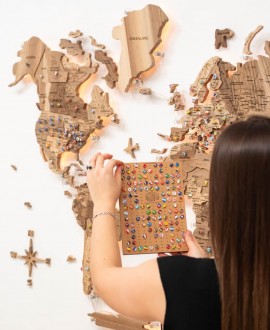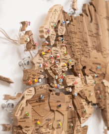 Карта может выполнять роль персонального тревел-борда: на ней удобно отмечать посещенные страны, планировать новые маршруты или просто вдохновляться идеями для путешествий. Натуральная древесина приятна на ощупь и хорошо передает текстуру материала, что делает каждое изделие уникальным.