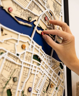 Каждое изделие проходит этап тщательной шлифовки и покрывается экологичным масловоском, который защищает древесину и подчеркивает ее уникальную текстуру. Дизайн картины выполнен в минималистичном стиле, где естественный цвет дерева контрастирует с точными линиями городской планировки. Вы получаете полностью готовое к монтажу изделие, которое гармонично впишется в дизайн офиса, гостиной или кабинета, наполняя пространство особым смыслом.