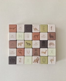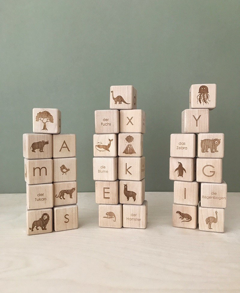 Набор из 30 деревянных кубиков с немецким алфавитом от A-Z + умлауты. Каждый кубик имеет закругленные грани. Они идеального размера для маленьких ручек ребенка.