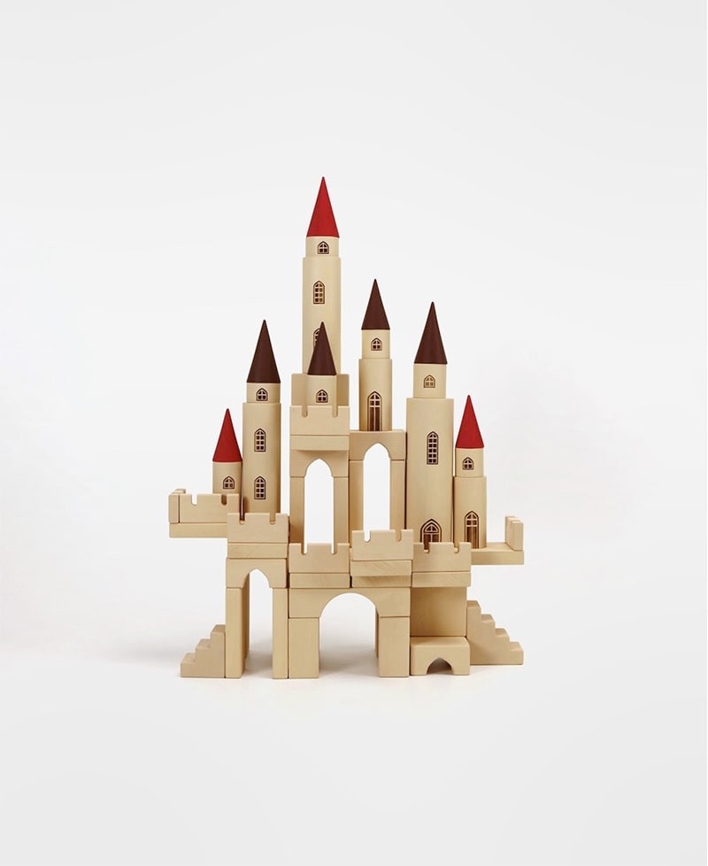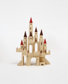 Конструктор содержит 65 деталей, созданных для бесконечных вариаций строительства волшебного замка. В наборе вы найдете 12 цилиндров с выгравированными окнами и дверями, 7 конусов двух размеров (3 больших и 4 меньших), а также разнообразные пластины, арки, лестницы и блоки.