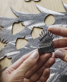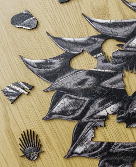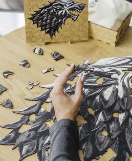 Фигурные детали пазла имеют тематические формы, которые намекают на легенды Севера, холодные земли Винтерфелла, героев и символы саги. Каждая деталь вырезана из натурального дерева – тактильное удовольствие и прочность гарантированы. Это настоящий вызов для внимательных, терпеливых и преданных поклонников Игры Престолов.