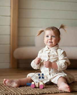 Игрушка раскрашена с обеих сторон пастельными красками на водной основе – без запаха, безопасными даже для самых маленьких исследователей. Гладко отшлифованное дерево приятное на ощупь, а округлые формы комфортны для маленьких ручек.