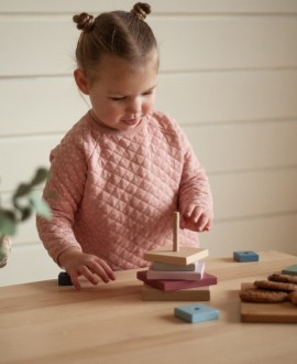 Изготовленная из тщательно отшлифованного явора и бука, древесина имеет приятную тактильную поверхность, а пастельные краски на водной основе – гипоаллергенны и без запаха. Все материалы – сертифицированы, а форма деталей идеально подходит для ручек малыша. Игрушка стимулирует мелкую моторику, логику, концентрацию и первые понятия о симметрии и размерах.