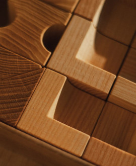 Уникальность набора заключается в особых формах деталей (Н-, L- и Т-образных), не просто ставящихся друг на друга, а создающих сложные взаимосвязи и объемы. Каждый элемент выточен из благородного массива ясеня, что делает строительство не только визуальным, но и тактильным удовольствием. Ручная шлифовка и финишное покрытие натуральным маслом с воском сохраняют живую энергию дерева, делая игрушку безопасной даже для самых маленьких архитекторов.