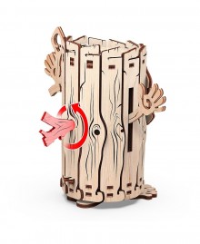 Этот добрый сказочный герой выглядит как живая колода, он держит ключ, как символ защиты сокровищ. В верхней части спрятано отверстие для монет, которое легко открыть прокрутив маленький сучок позади. А вот как получить монетки наружу - сказочная тайна.