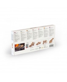 Внутри упаковки вы найдете фанерные доски, из которых нужно просто выдавить готовые детали и трансформировать их в готовую модель. Несколько способов соединения деталей, используемых в спортивном автомобиле, являются изобретением и защищены международными патентами. Собирается модель по пошаговой иллюстрованой инструкции с объяснениями на 11 языках.