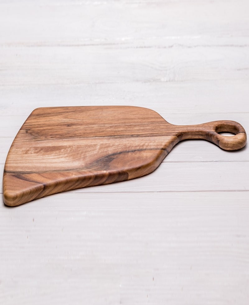 На этой деревянной досочке можно не только нарезать продукты для приготовления вкусных блюд, но и подавать готовые закуски родным или гостям. Благодаря нестандартной форме данная доска становится оригинальным деревянным аксессуаром на кухню.