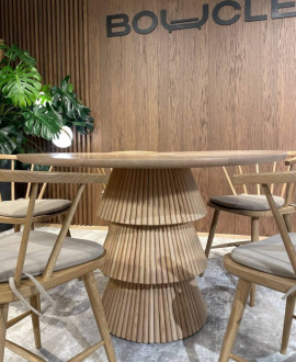Круглая форма столешницы способствует созданию особой атмосферы доверия и гармонии во время совместных обедов. Каждый стол является результатом кропотливой ручной работы, где мастерское исполнение подчеркивает живую энергетику и индивидуальный рисунок натурального дерева.